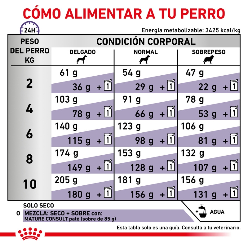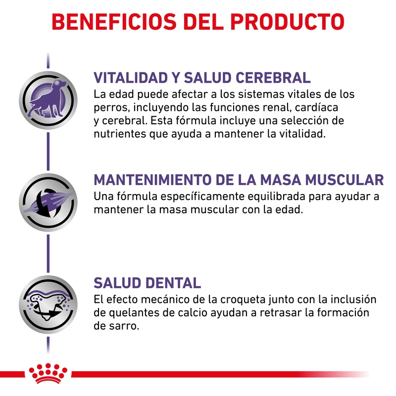 Su equilibrio nutricional está pensado para preservar la masa muscular en esta fase. Gracias al efecto de limpieza mecánica de las croquetas y la inclusión de un agente que ayuda a controlar el calcio, ROYAL CANIN® Mature Consult contribuye a prevenir la acumulación de sarro dental. Además, este alimento favorece un ambiente desfavorable para la formación de cristales y cálculos urinarios.