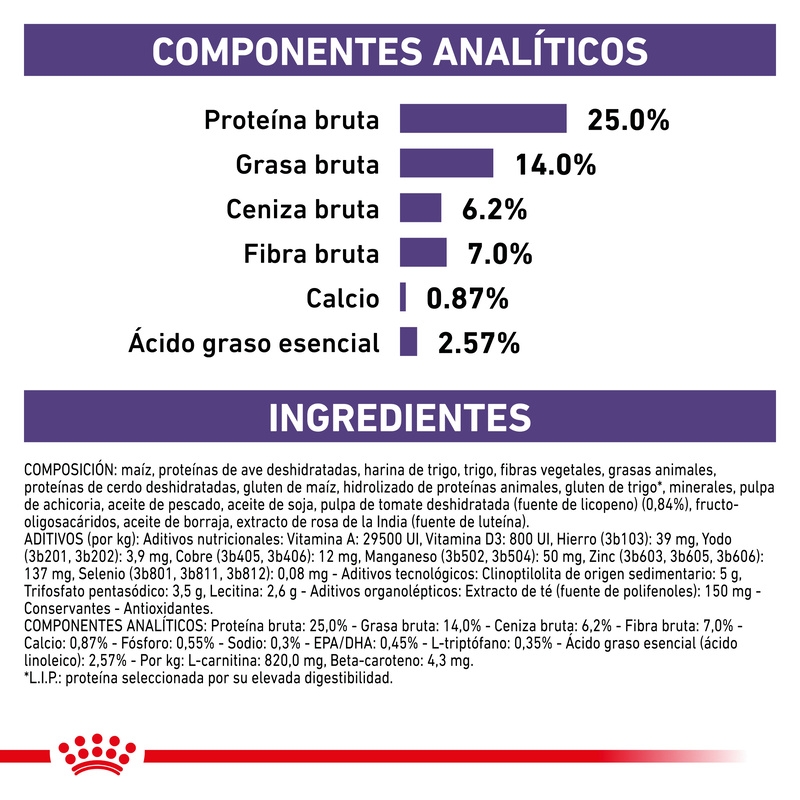 COMPONENTES ANALÍTICOS: Proteína bruta: 25,5% - Grasa bruta: 14,0% - Ceniza bruta: 6,2% - Fibra bruta: 7,0% - Calcio: 0,87% - Fósforo: 0,55% - Sodio: 0,3% - EPA/DHA: 0,45% - L-triptófano: 0,35% - L-carnitina: 820,0 mg/kg - Beta-caroteno: 4,3 mg/kg.