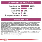 Componentes analíticos: Proteína bruta: 22,5%, Grasa bruta: 16,0%, Ceniza bruta: 5,1%, Fibra bruta: 1,5%, Calcio: 0,8%, Fósforo: 0,5%, Potasio: 0,6%, Sodio: 0,35%-Ácido graso esencial (ácido linoleico): 2,66%-EPA/DHA: 0,5%-Ácidos grasos omega 3: 0,86%. De trigo*. *L.I.P.: proteína seleccionada por su elevada digestibilidad.
