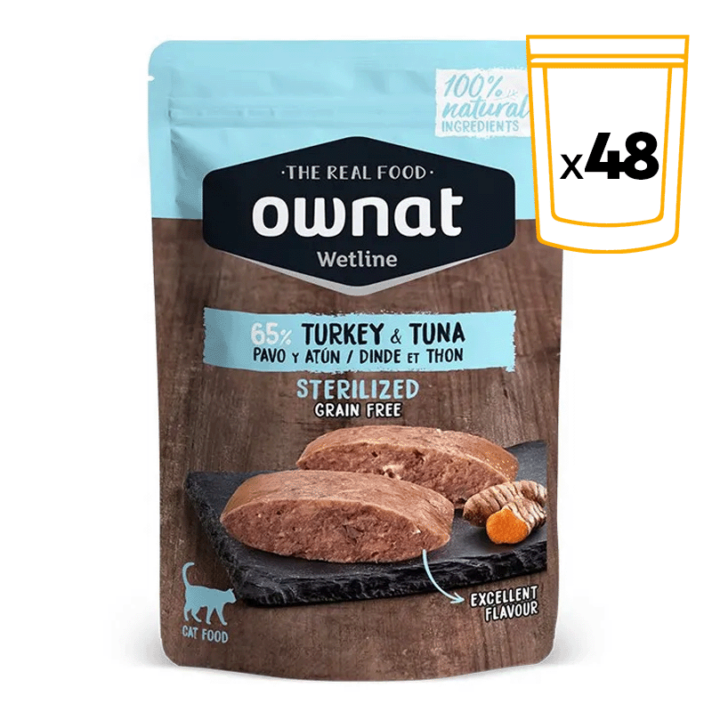 La Ownat Wetline Pavo y Atún es una comida húmeda diseñada para gatos esterilizados, que proporciona una alimentación 100% natural y equilibrada. Con un enfoque en la salud y el bienestar de las mascotas, Ownat ha creado una receta que combina ingredientes seleccionados cuidadosamente, de origen local y garantizado, asegurando una nutrición de alta calidad.