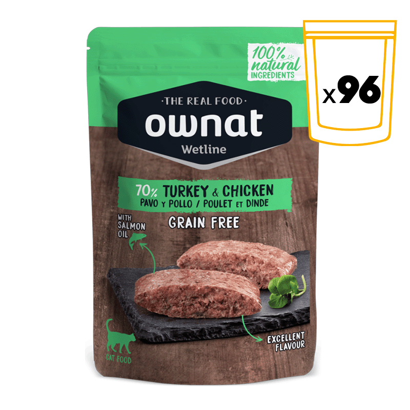 La Ownat Wetline Pavo y Pollo está diseñada para ser una opción nutricionalmente completa para gatos de cualquier edad o tamaño. Su fórmula contribuye a mantener una dieta equilibrada que favorece la salud digestiva, un pelaje brillante y el bienestar general de tu gato. Al estar libre de cereales y gluten, también es adecuada para felinos con sensibilidades alimentarias.