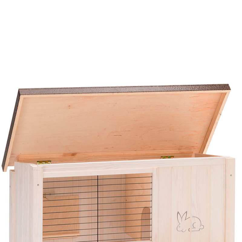 ¿Mantenimiento? ¡Ningún problema! La conejera Ranch 100 Basic tiene el techo abatible para que puedas coger y soltar a tu roedor cómodamente y limpiar el interior de manera más fácil. También dispone de una amplia bandeja de madera para recoger la suciedad, extraíble. La abertura que comunica los dos pisos dispone de una tapa de cierre, muy práctica durante la limpieza, y de un reborde en todo su perímetro que evita la caída de residuos del lecho del animal a la parte de abajo.