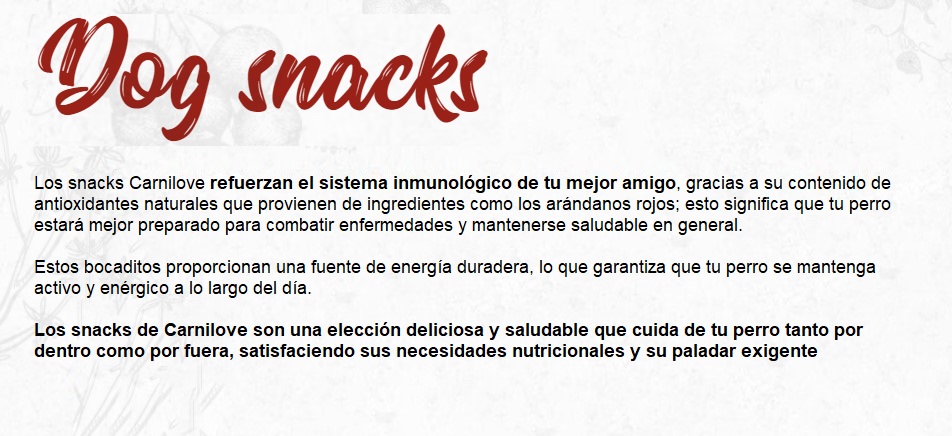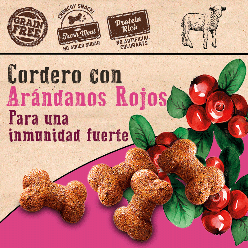 Gracias a su formulación, estos bocaditos aseguran una digestión suave y sin molestias, mantienen el pelaje brillante y la piel saludable, refuerzan el sistema inmunológico con antioxidantes naturales provenientes de los arándanos rojos y proporcionan energía duradera para mantener a tu perro activo a lo largo del día. Además, su irresistible sabor a cordero los convierte en una opción deliciosa y segura para perros con sensibilidades estomacales.