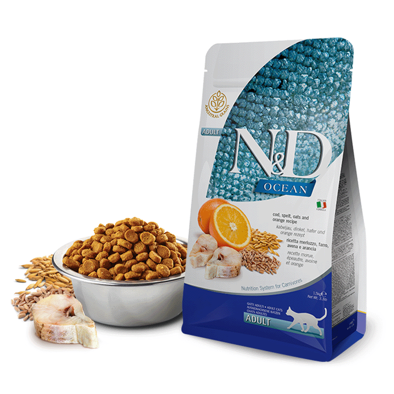 Experiencia Culinaria Excepcional: Farmina N&D Ocean Adult ofrece una experiencia de sabor única con su mezcla exclusiva de bacalao fresco y naranja. Este alimento premium para gatos no solo es delicioso, sino que también garantiza una gran aceptación, incluso entre los gatos más caprichosos.