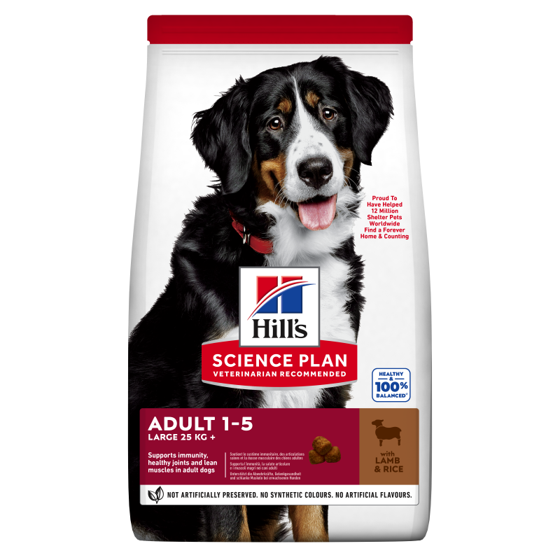 Hill's™ Science Plan™ LARGE BREED ALIMENTO PARA PERROS ADULTOS con CORDERO (9%) y ARROZ (6%) es la opción óptima para perros de gran tamaño, asegurando una alimentación completa para perros de más de 25 kg y con edades entre 1 y 5 años.
