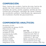 COMPOSICIÓN: Maíz, harina de cordero, harina de soja, harina de gluten de maíz, grasa animal, arroz cervecero, solubles de carne, aceite vegetal, semilla de lino, sustancias minerales, cartílago de cerdo (fuente de condroitín sulfato), hidrolizado de caparazón de crustáceo (fuente de glucosamina).