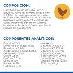 COMPOSICIÓN: Maíz, trigo, harina de pollo y pavo, celulosa, harina de salvado de guisante, solubles de carne, grasa animal, pulpa de remolacha, semilla de lino, sustancias minerales, aceite vegetal, cartílago de cerdo (fuente de condroitín sulfato), hidrolizado de caparazón de crustáceo (fuente de glucosamina).