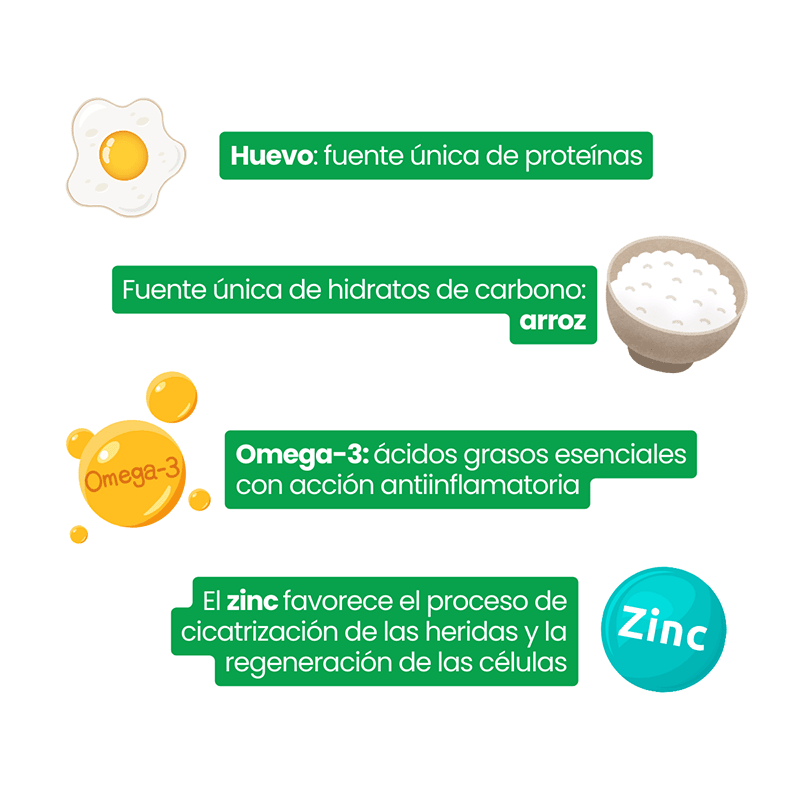 Arroz (67%), huevo entero deshidratado (22%), aceite de pescado, cloruro de potasio, carbonato de calcio, fosfato mono-dicálcico, cloruro de sodio. Fuentes de proteínas: huevos. Fuentes de carbohidratos: arroz.