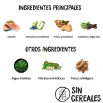 Salmón fresco* (min. 30% antes de la extrusión), salmón deshidratado (16%), hidrolizado de salmón (14%), guisantes enteros* (12%), raíces de mandioca* (9%), grasa animal (preservada con antioxidantes naturales), vaina de algarroba* (5%), patata deshidratada* (5%), manzana* (1%), pulpa de remolacha, aceite de salmón (preservado con antioxidantes naturales), sal gema*, alfalfa deshidratada*, fructo y manano oligosacáridos, algas marinas deshidratadas* (500 mg/kg), glucosamina (500 mg/kg), yucca schidigera, condroitín sulfato (100 mg/kg), arándanos* (100 mg/kg), tomillo* (80 mg/kg), flor de manzanilla* (80 mg/kg), hinojo* (80 mg/kg), equinácea* (80 mg/kg), té verde* (80 mg/kg).*INGREDIENTES NATURALES