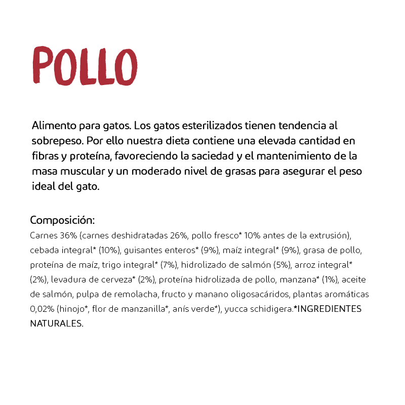 Carnes 36% (carnes deshidratadas 26%, pollo fresco* 10% antes de la extrusión), cebada integral* (10%), guisantes enteros* (9%), maíz integral* (9%), grasa de pollo, proteína de maíz, trigo integral* (7%), hidrolizado de salmón (5%), arroz integral* (2%), levadura de cerveza* (2%), proteína hidrolizada de pollo, manzana* (1%), aceite de salmón, pulpa de remolacha, fructo y manano oligosacáridos, plantas aromáticas 0,02% (hinojo*, flor de manzanilla*, anís verde*), yucca schidigera. *INGREDIENTES NATURALES