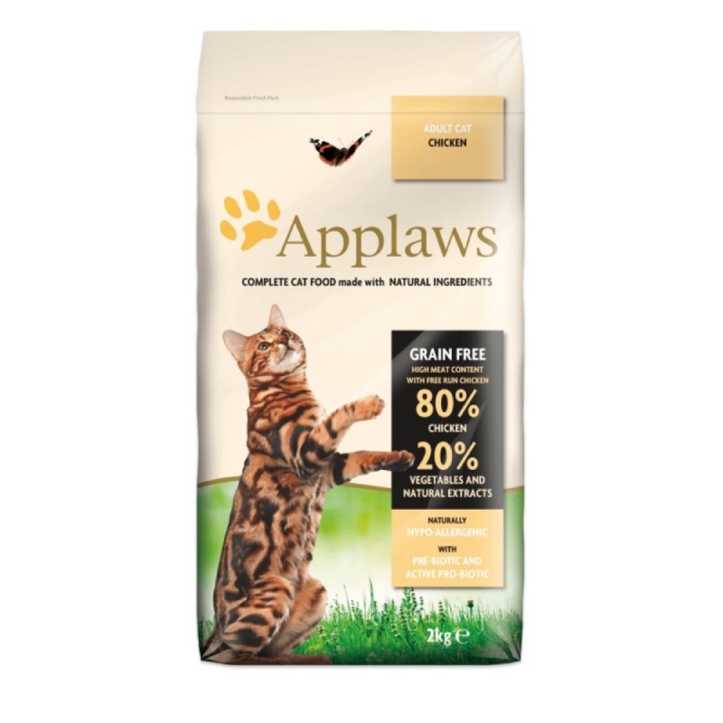 Alimento seco de pollo (65%), carne de pollo picada (17%), patata, levadura de cerveza, pulpa de remolacha, salsa de pollo, aceite de salmón, vitaminas y minerales, huevo seco, fibra vegetal de celulosa (0.03%), cloruro de sodio, carbonato de calcio, alga marina / laminaria, arándanos, metionina-DL, cloruro de potasio, extracto de yuca, extracto de cítricos, extracto de romero.