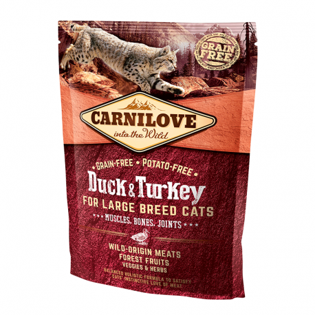 El pienso Carnilove Duck&Turkey para gatos de razas grandes es un alimento completo que favorece el bienestar de los músculos, huesos y articulaciones en gatos de razas como: Maine Coon, Bobtail americano, Ragdoll, Savannah, Chausie, Siberiano, Bosque de Noruega y Ocicat.