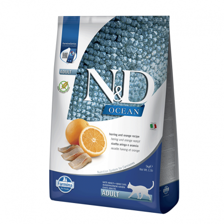 Farmina N&D Adult Ocean es una fórmula innovadora para gatos adultos que se caracteriza por ser libre de cereales y contiene arenque y naranja. La combinación única de ingredientes, como el arenque fresco y la naranja deshidratada, conquista hasta a los gatos más exigentes, logrando una aceptación excepcional. Las siglas N&D reflejan su enfoque "natural y delicioso", incorporando componentes naturales como el arenque fresco, las batatas y la fruta deshidratada. Sin cereales, este alimento es idóneo para gatos con alergias, ya que proporciona un alto contenido de proteínas animales y aporta vitaminas, antioxidantes y nutrientes esenciales.