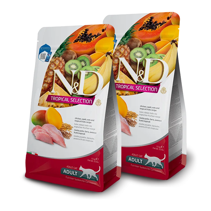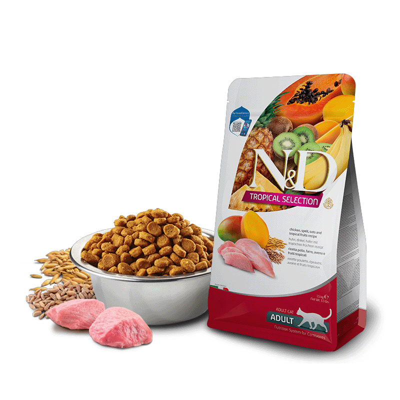 Farmina N&D Gato Tropical Selection Pollo ha sido cuidadosamente formulado para promover la salud y el bienestar de tu gato. Este alimento completo no solo es una fuente de nutrición esencial, sino que también brinda una experiencia culinaria excepcional para tu mascota felina.