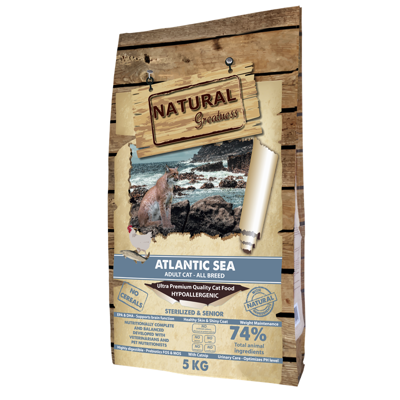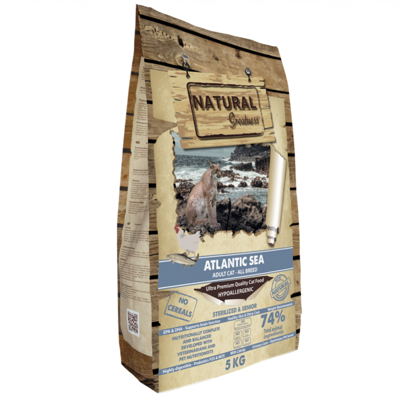 Con Atlantic Sea, Natural Greatness ofrece un pienso natural que une nutrición, salud y gran sabor, diseñado para gatos adultos esterilizados y mayores. Una alternativa de pienso natural que garantiza digestión saludable, control de peso y bienestar diario.
