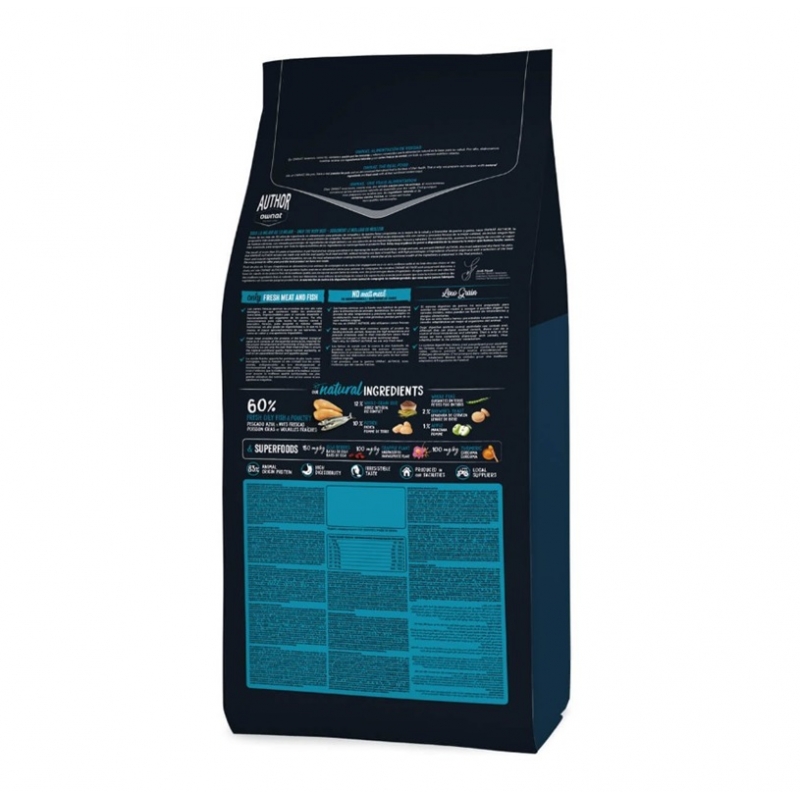 Pescado azul fresco* (25 % mín. antes de la extrusión), gallina fresca* (25 % mín. antes de la extrusión), arroz integral* (12 %), pato fresco* (10 % mín. antes de la extrusión), patata deshidratada* (10 %), guisantes enteros* (8 %), levadura de cerveza* (2 %), pulpa de remolacha, grasa avícola (preservada con antioxidantes naturales), aceite de salmón (preservado con antioxidantes naturales), frutas frescas antes de la extrusión (manzana* 1 %), raíces de achicoria (FOS)*, extracto de levadura (MOS), algas marinas deshidratadas*, glucosamina (500 mg/kg), yucca shidigera, bayas de goji* (150 mg/kg), condroitín sulfato (100 mg/kg), harpagófito* (100 mg/kg), cúrcuma* (100 mg/kg), hinojo* (100 mg/kg).