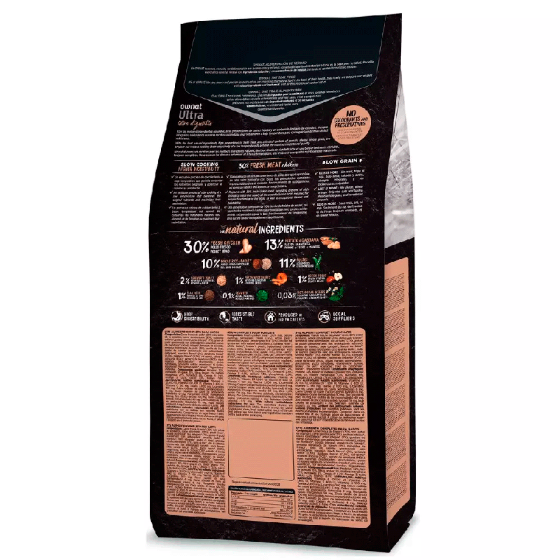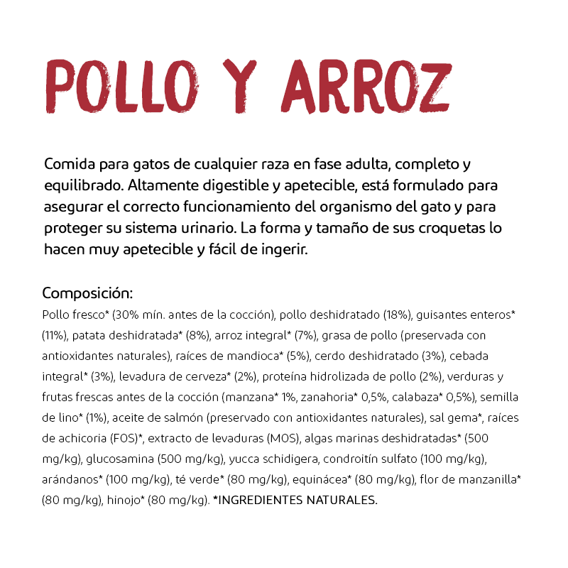 Pollo fresco* (30% mín. antes de la cocción), pollo deshidratado (18%), guisantes enteros* (11%), patata deshidratada* (8%), arroz integral* (7%), grasa de pollo (preservada con antioxidantes naturales), raíces de mandioca* (5%), cerdo deshidratado (3%), cebada integral* (3%), levadura de cerveza* (2%), proteína hidrolizada de pollo (2%), verduras y frutas frescas antes de la cocción (manzana* 1%, zanahoria* 0,5%, calabaza* 0,5%), semilla de lino* (1%), aceite de salmón (preservado con antioxidantes naturales), sal gema*, raíces de achicoria (FOS)*, extracto de levaduras (MOS), algas marinas deshidratadas* (500 mg/kg), glucosamina (500 mg/kg), yucca schidigera, condroitín sulfato (100 mg/kg), arándanos* (100 mg/kg), té verde* (80 mg/kg), equinácea* (80 mg/kg), flor de manzanilla* (80 mg/kg), hinojo* (80 mg/kg). *INGREDIENTES NATURALES
