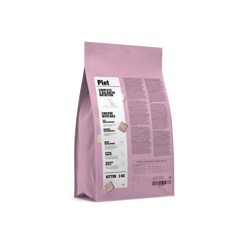 Pienso especial para gatitos sabor pollo con arroz. PLET ofrece un alimento nutritivo y equilibrado con ingredientes de altísima calidad. Su principal ingrediente, 20% de pollo fresco aporta grandes beneficios nutricionales en la primera etapa de vida de tu mejor amigo.