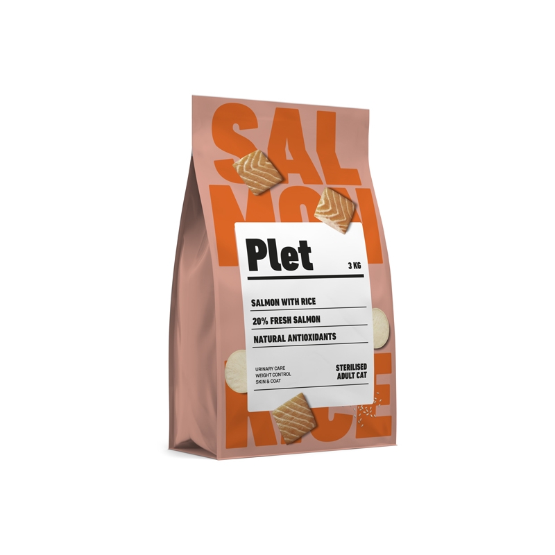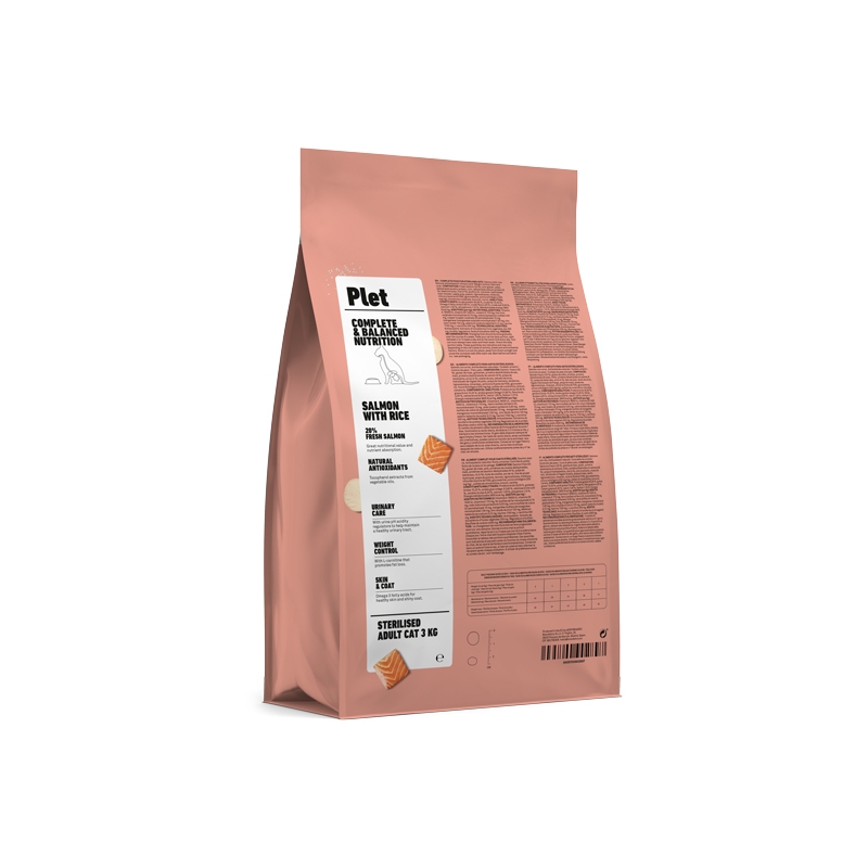 Pienso para gatos esterilizados sabor a salmón con arroz. PLET ofrece un alimento nutritivo y equilibrado con ingredientes de altísima calidad. Su principal ingrediente, 20% de salmón fresco aporta grandes beneficios nutricionales en todas las etapas de vida de tu mejor amigo.