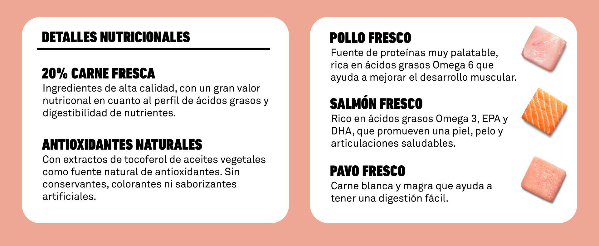 Composición: Salmón fresco (20 %), gluten de maíz, guisantes (12 %), proteína deshidratada de ave, maíz, proteína deshidratada de salmón (6 %), pulpa de remolacha, arroz (4 %), aceite de ave, salvado de arroz, hidrolizado de hígado de pollo, pulpa de manzana, levaduras, lignocelulosa, minerales, achicoria (fuente de FOS), glucosamina, Yucca Schidigera (200 mg/kg), sulfato de condroitina, brócoli, zanahoria.