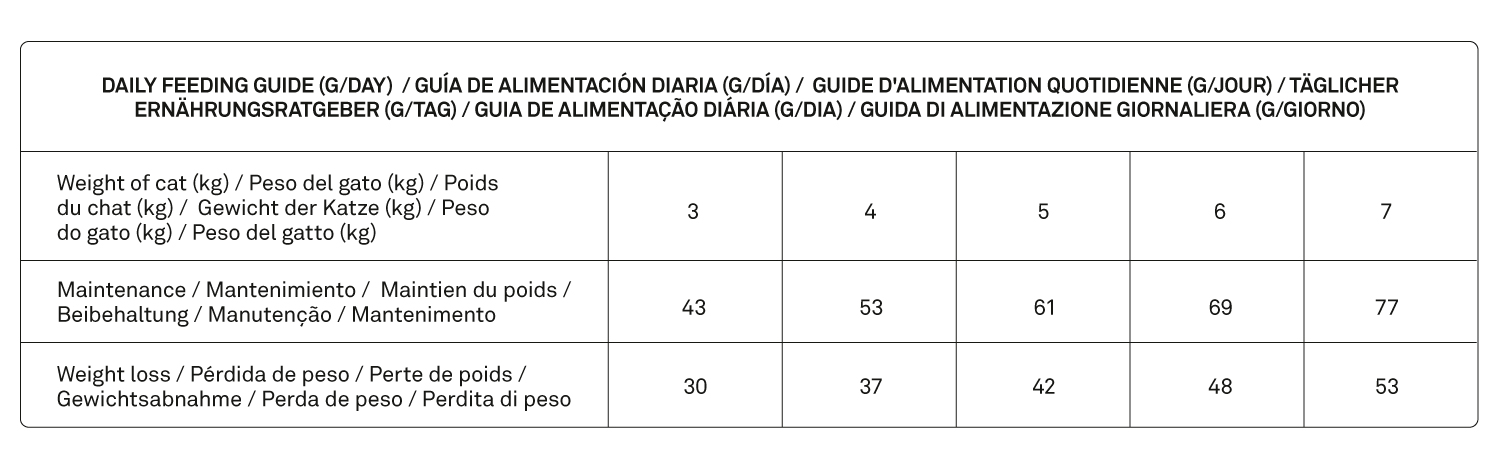 Ver tabla de ración diaria, estas cantidades son orientativas, pueden variar en función de la actividad, raza del gato y condiciones ambientales.