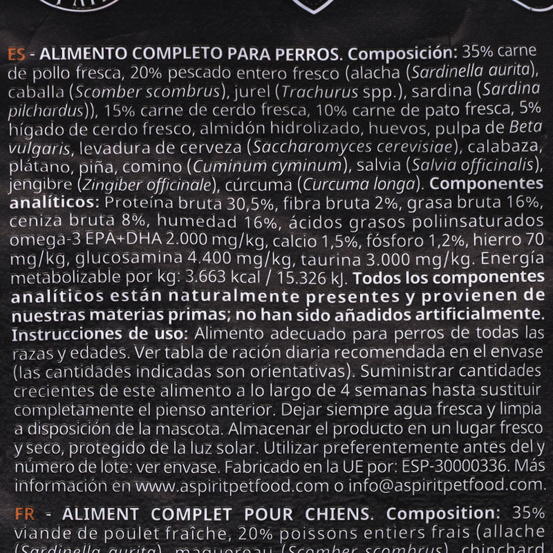 35% carne de pollo fresca, 20% pescado entero fresco, jurel, sardina, 15% carne de cerdo fresca, 10% carne de pato fresca, 5% hígado de cerdo fresco, almidón hidrolizado, huevos, pulpa de Beta Vulgaris, levadura de cerveza, calabaza, plátano, piña, comino, salvia, jengibre, cúrcuma.