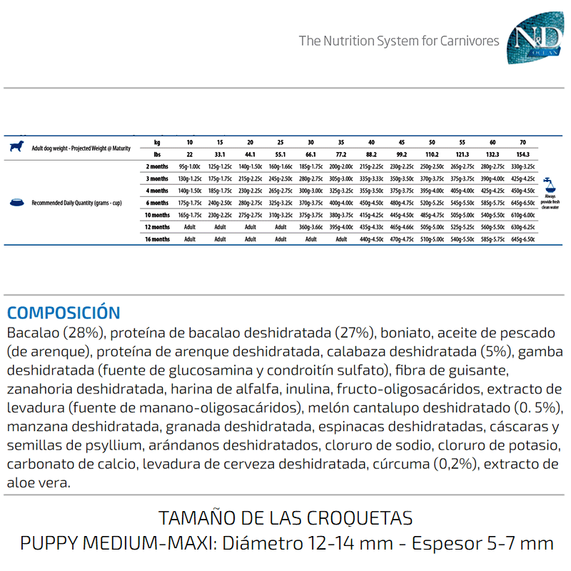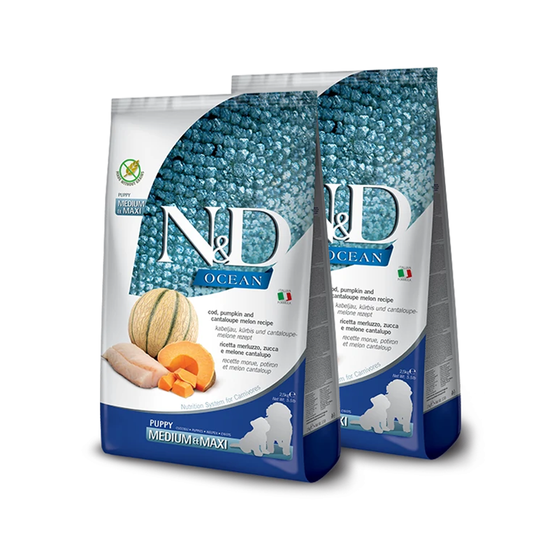 Descubre la fórmula Natural&Delicious Ocean (ND) de Farmina, una opción premium para cachorros de razas medianas y grandes. Elaborada con ingredientes naturales y sin cereales, esta dieta equilibrada resalta el bacalao fresco (28%), calabaza y melón.