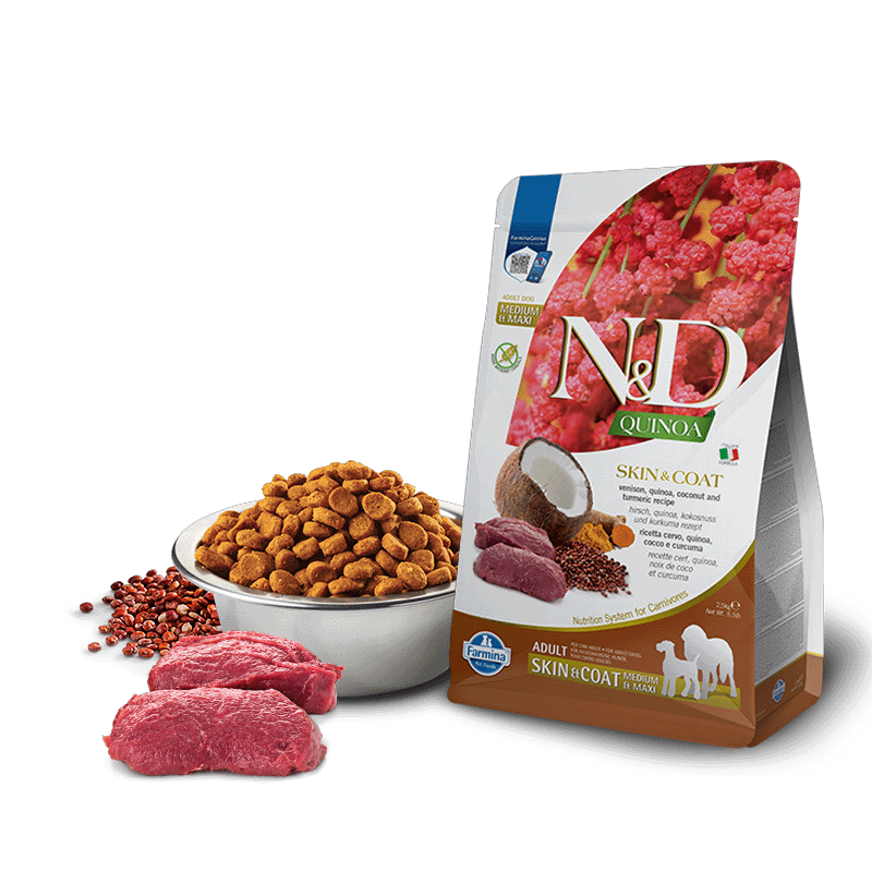 Farmina ND N&D Quinoa Skin Coat es un alimento especialmente equilibrado para perros adultos, diseñado específicamente para aquellos con piel y pelaje sensibles. Este alimento está formulado con ingredientes de alta calidad para promover la salud de la piel y el pelaje de tu perro.