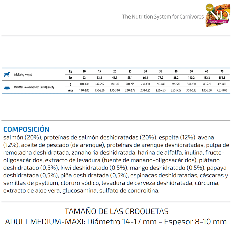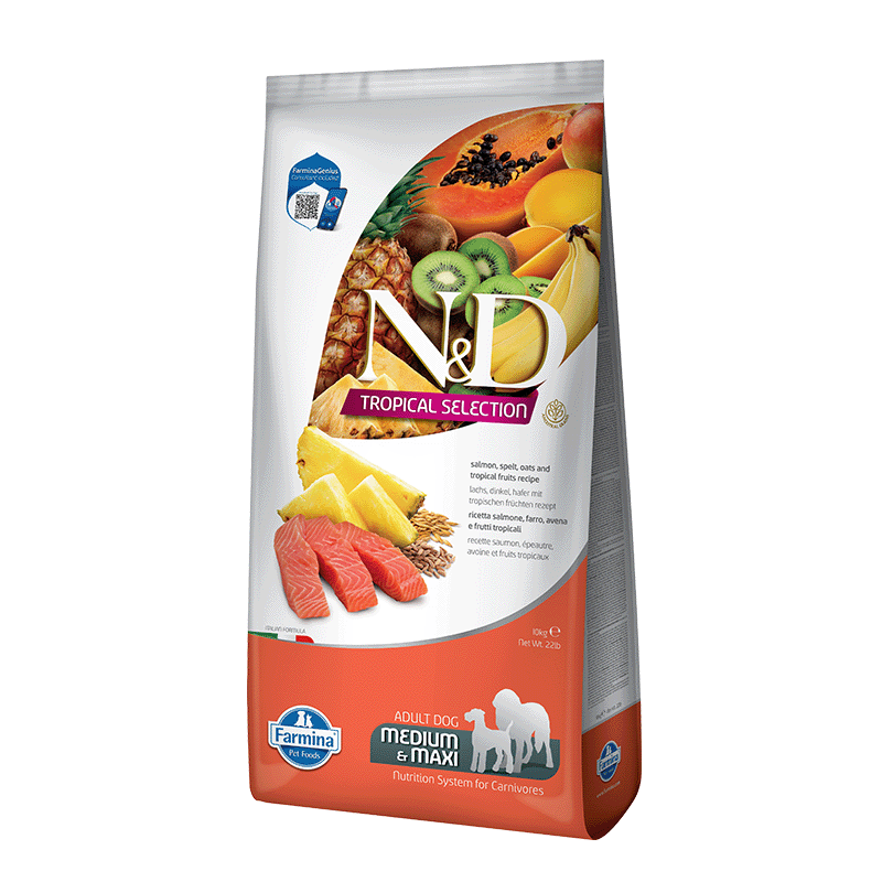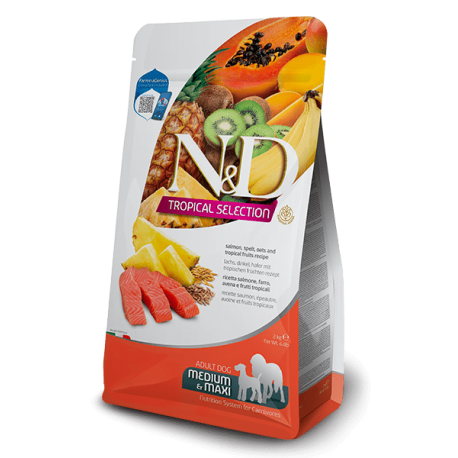 Farmina Tropical para perros de tamaño mediano y grande con salmón es mucho más que simplemente alimento para perros. Es el resultado de una meticulosa formulación, diseñada específicamente para las necesidades únicas de los perros de razas medianas y grandes. Esta fórmula exclusiva combina ingredientes de alta calidad como el salmón, la espelta, la avena, y una variedad de frutas tropicales, creando una experiencia culinaria excepcional para tu perro.