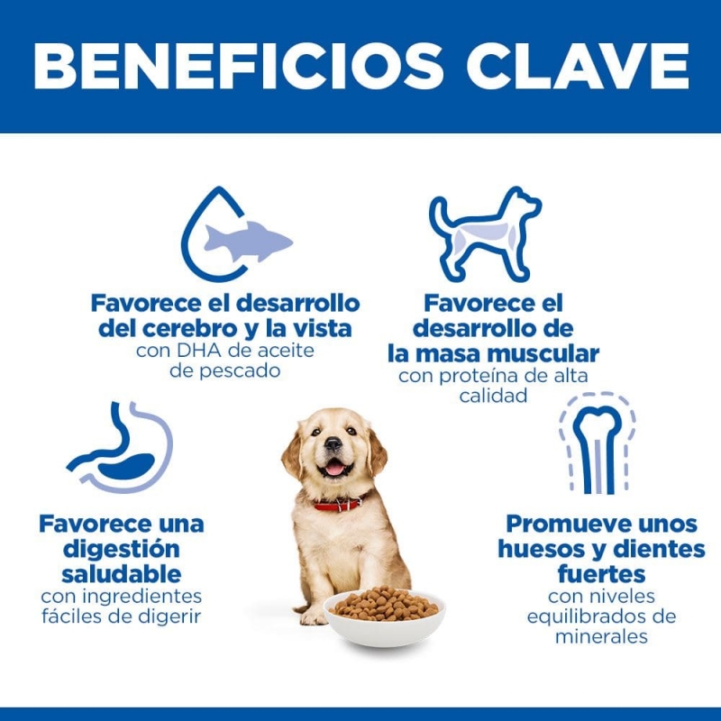 Esta fórmula, enriquecida con minerales para fortalecer huesos y dientes, y con DHA del aceite de pescado para un desarrollo cerebral y visual saludable, junto con proteínas de alta calidad para un crecimiento muscular magro, es la elección adecuada. Sin embargo, no se recomienda para perros adultos o mayores. Asegura un inicio saludable para tu cachorro con Hill's™ Science Plan™ LARGE BREED con Pollo.