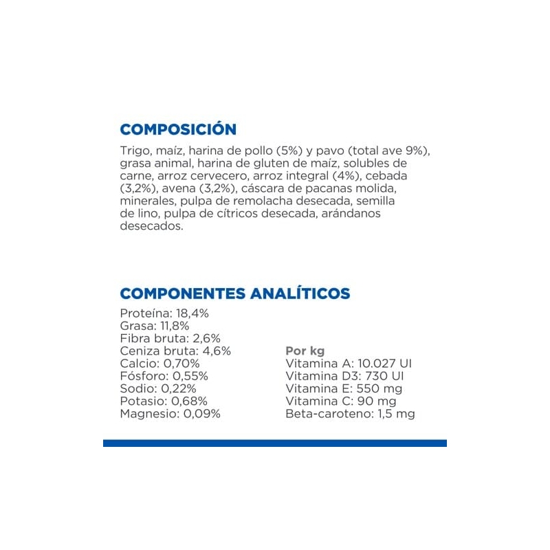 Ingredientes: trigo, maíz, pollo (5%) y harina de pavo (ave total 9%), grasa animal, harina de gluten de maíz, solubles de carne, arroz cervecero, arroz integral (4%), cebada (3,2%), avena (3,2%), cáscara de nuez pacana, minerales, pulpa de remolacha, semilla de lino, pulpa de cítricos desecada, arándanos desecados.