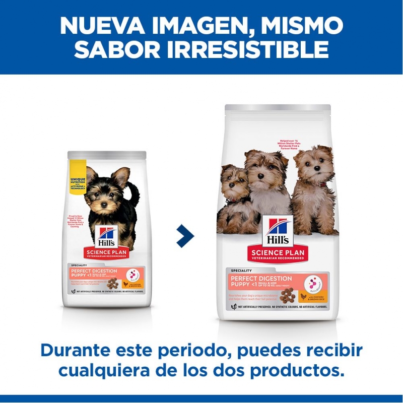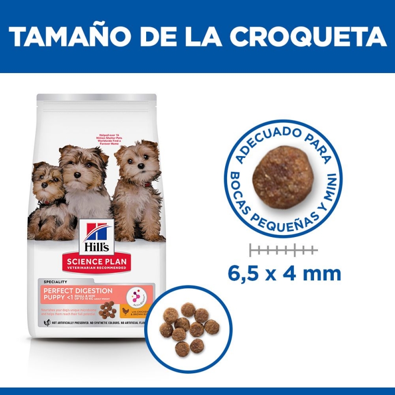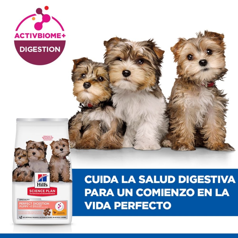 Nutrición Integral para Cachorros Pequeños: Hill's Science Plan Perfect Digestion proporciona una alimentación completa para cachorros de razas pequeñas y mini hasta los 12 meses.