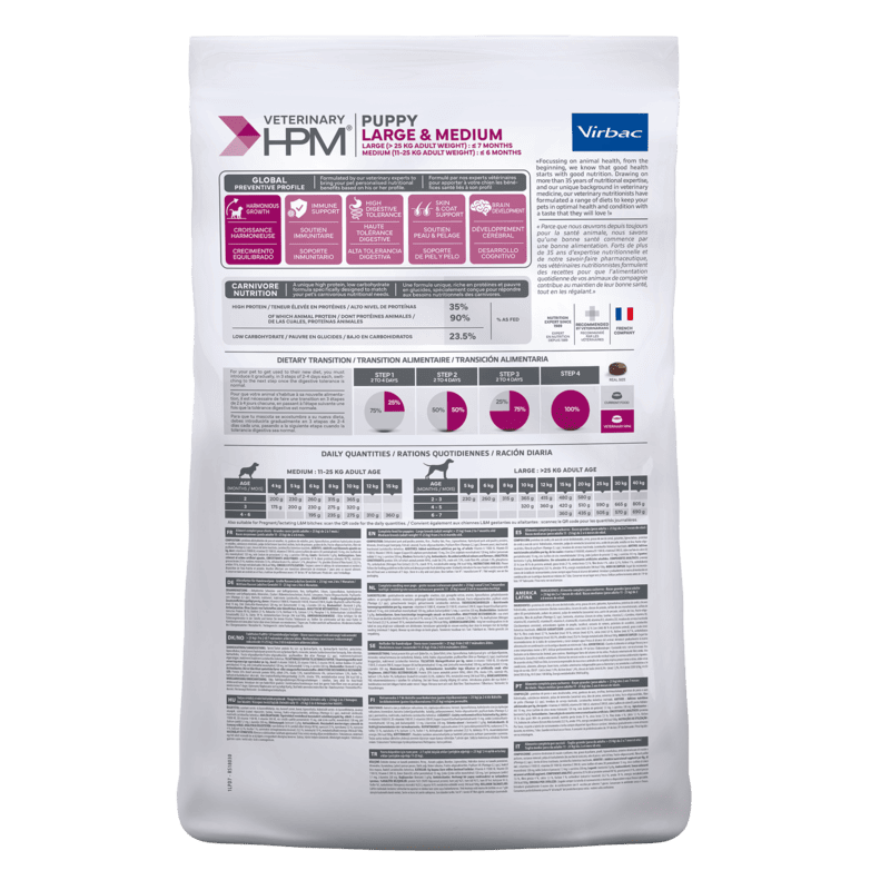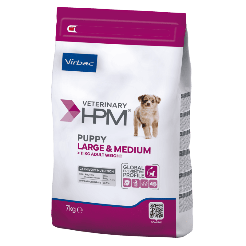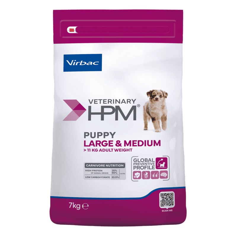 VETERINARY HPM Baby Dog Large & Medium es una alimentación completa diseñada para cachorros de razas grandes (con peso adulto superior a 25 kg) hasta los 7 meses de edad, y para razas medianas (con peso adulto entre 11 y 25 kg) hasta los 6 meses. También es recomendada para perras de razas grandes y medianas en período de gestación o lactancia.