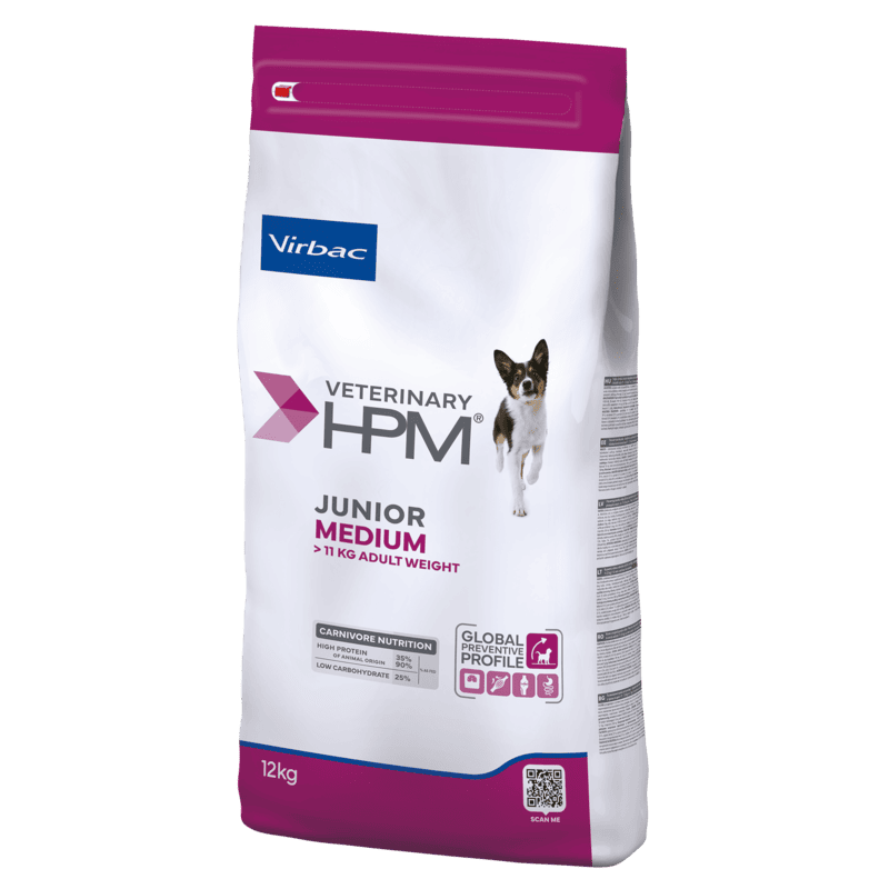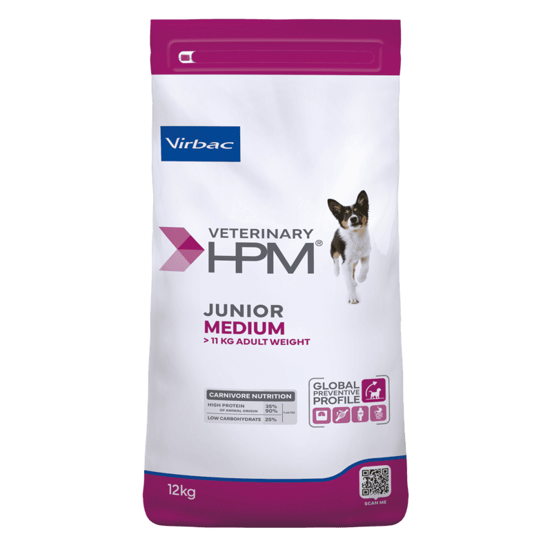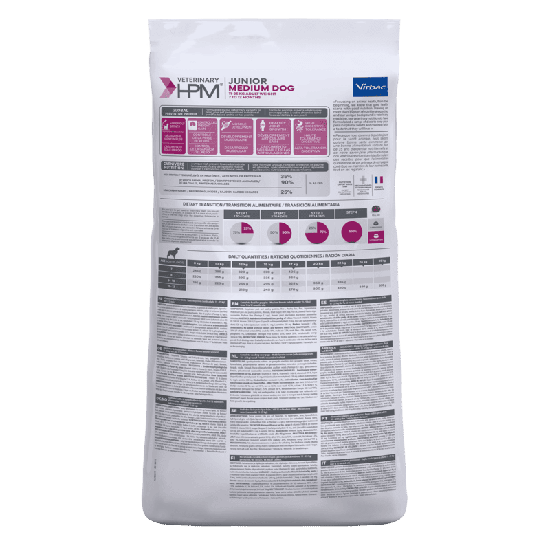 VETERINARY HPM Junior Dog Special Medium es un alimento completo diseñado para cachorros de razas medianas (peso adulto 10-25 kg) durante la fase post pico de crecimiento, que comprende de los 7 a los 12 meses de edad.