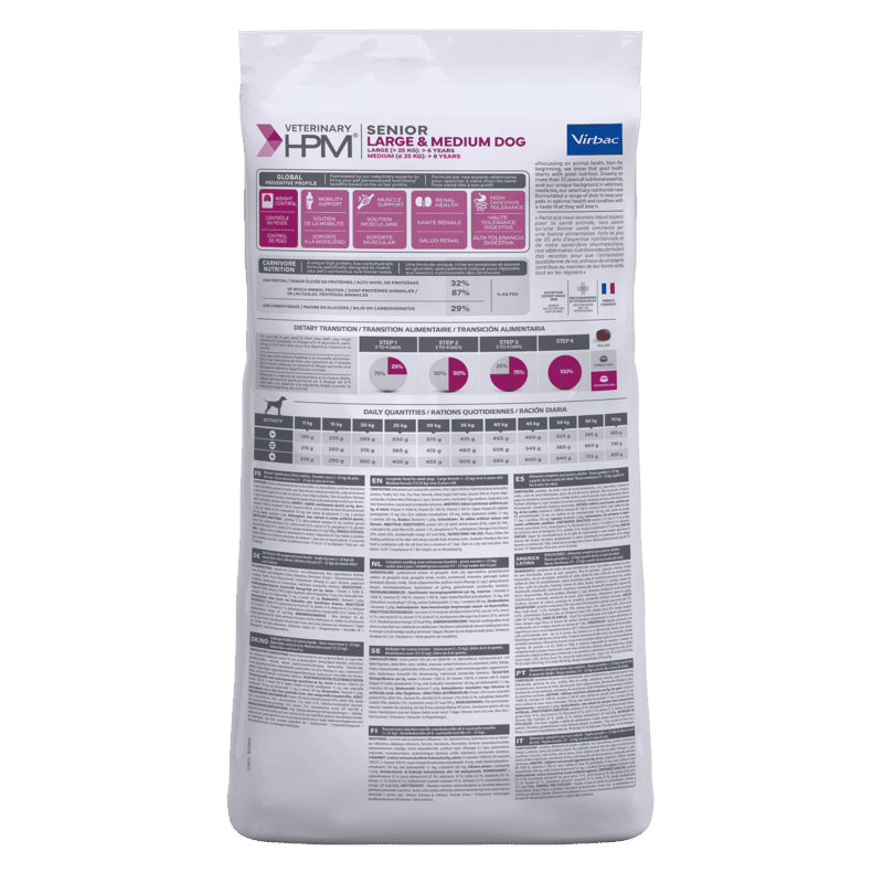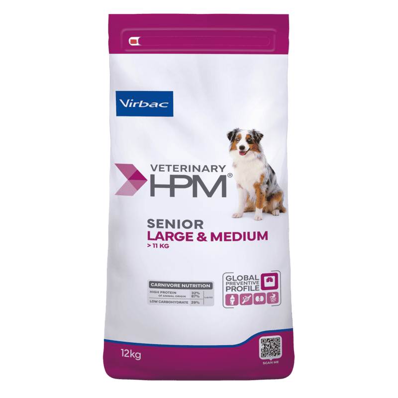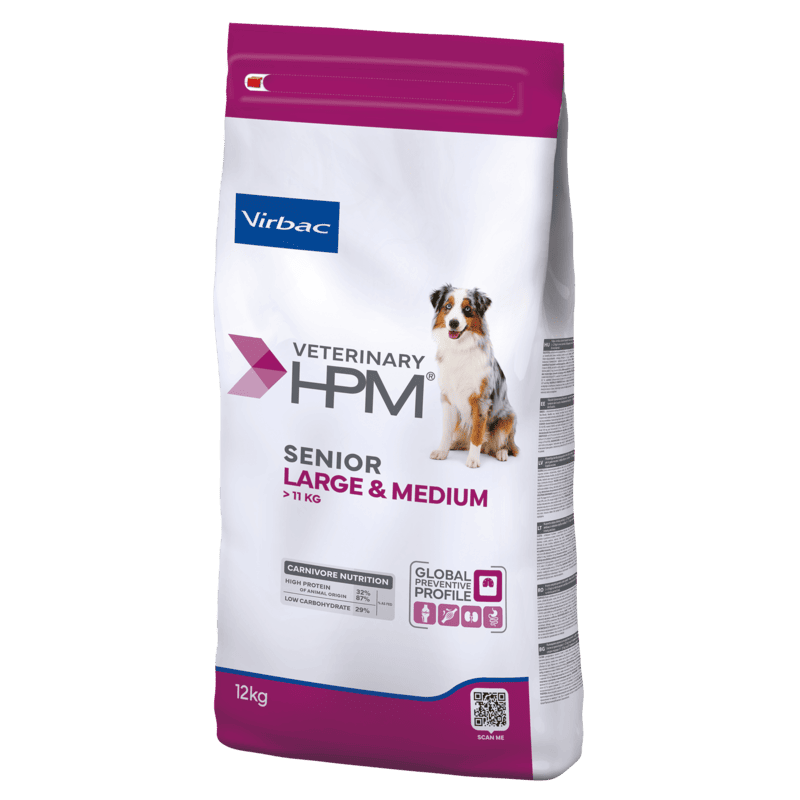 VETERINARY HPM Senior Dog Large & Medium brinda una nutrición completa diseñada para perros de razas grandes no esterilizados (> 25 kg) a partir de los 6 años y perros de razas medianas (10 - 25 kg) a partir de los 8 años.