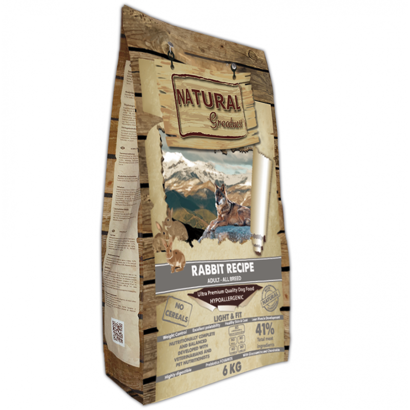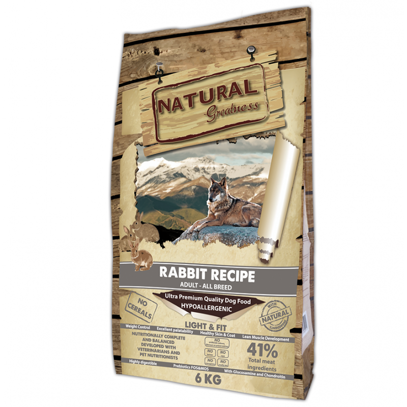 Natural Greatness Perros ofrece una receta monoproteica a base de carne fresca de conejo, baja en grasa y de fácil digestión. Este pienso natural está libre de cereales y enriquecido con frutas, verduras, fibras, condroprotectores y L-Carnitina. Su fórmula hipoalergénica lo convierte en una opción perfecta para controlar el peso, cuidar la digestión y mantener la vitalidad.