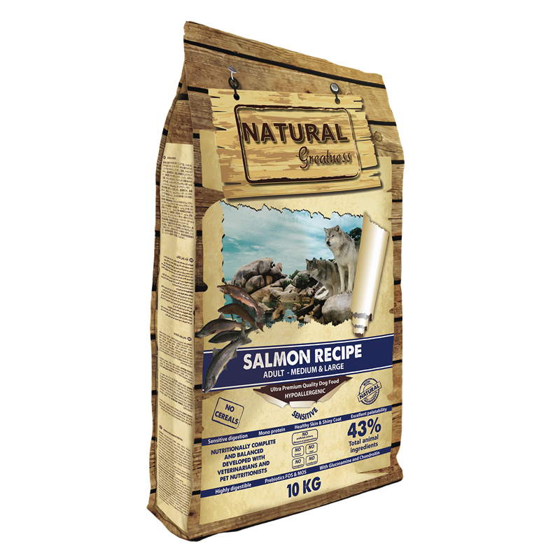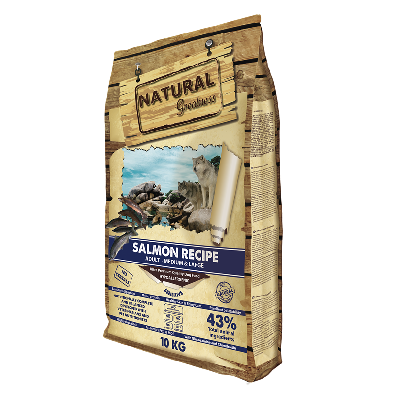 Natural Greatness Perros presenta un pienso natural diseñado para perros medianos y grandes, elaborado con salmón fresco como única fuente de proteína animal. Sin cereales y con propiedades hipoalergénicas, este alimento aporta digestibilidad, energía de calidad y gran sabor. Con frutas, verduras y suplementos funcionales, Natural Greatness Salmón favorece la digestión, la piel sana, el pelaje brillante y un sistema inmune fuerte.