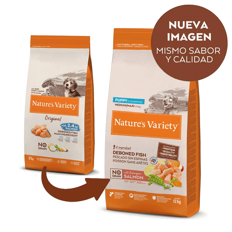 ¡Haz tu pedido ahora y asegura un crecimiento óptimo para tu cachorro con Natures Variety No Grain Medium Maxi Salmón Noruego!