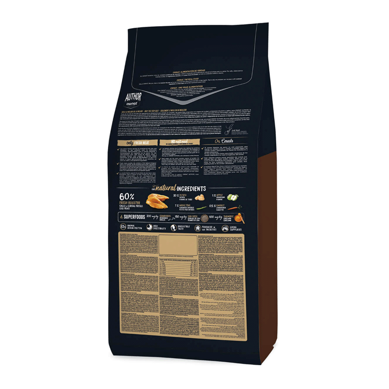 Gallo de corral fresco* (60 % mín. antes de la extrusión), patata deshidratada* (20 %), guisantes enteros* (7 %), grasa avícola (preservada con antioxidantes naturales), aceite de salmón (preservado con antioxidantes naturales), pulpa de remolacha, verduras y frutas frescas antes de la extrusión (manzana* 1 %, zanahoria* 0,5 %), vaina de algarroba*, raíces de achicoria (FOS)*, extracto de levadura (MOS), algas marinas deshidratadas*, glucosamina (500 mg/kg), yucca shidigera, arándanos* (200 mg/kg), semillas de chía* (150 mg/kg), condroitín sulfato (100 mg/kg), cúrcuma* (100 mg/kg), hinojo* (100 mg/kg). *Ingredientes naturales.