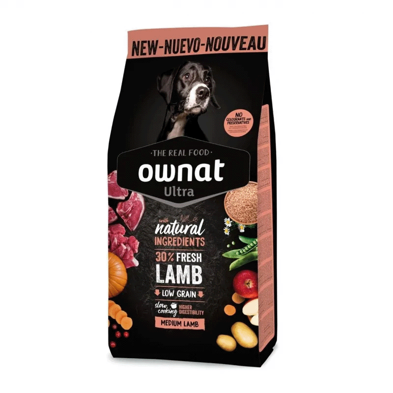 Ownat Ultra Medium Lamb & Rice es un alimento balanceado que emplea Contiene una generosa proporción de carne fresca y minimiza los cereales para favorecer la digestión y reducir posibles alergias o intolerancias. Este alimento se produce mediante un proceso de <strong-cocción lenta a baja temperatura, preservando así los nutrientes y el sabor de la carne.