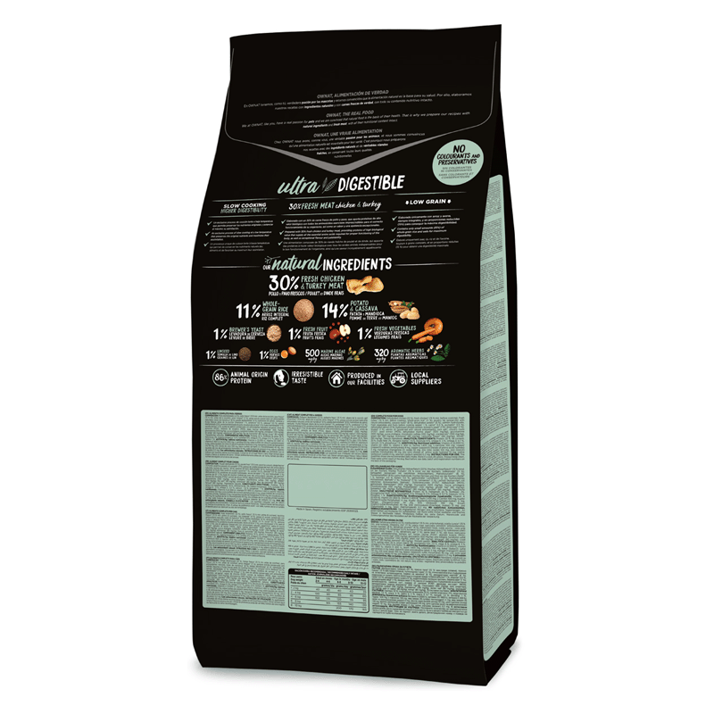 Pollo fresco* (15% mín. antes de la cocción), pavo fresco* (15% mín. antes de la cocción), pollo deshidratado (14%), grasa de pollo (preservada con antioxidantes naturales), guisantes enteros* (8%), patata deshidratada* (8%), arroz integral* (7%), raíces de mandioca* (4%), cerdo deshidratado (4%), cebada integral* (3%), salmón deshidratado (2,5%), levadura de cerveza* (2%), proteína hidrolizada de pollo (2%), huevo deshidratado* (2%), verduras y frutas frescas antes de la cocción (manzana* 1%, zanahoria* 0,5%, calabaza* 0,5%), semilla de lino* (1%), aceite de salmón (preservado con antioxidantes naturales), sal gema*, raíces de achicoria (FOS)*, extracto de levaduras (MOS), algas marinas deshidratadas* (500 mg/kg), glucosamina (500 mg/kg), yucca schidigera, condroitín sulfato (100 mg/kg), arándanos* (100 mg/kg), té verde* (80 mg/kg), equinácea* (80 mg/kg), flor de manzanilla* (80 mg/kg), hinojo* (80 mg/kg). *INGREDIENTES NATURALES