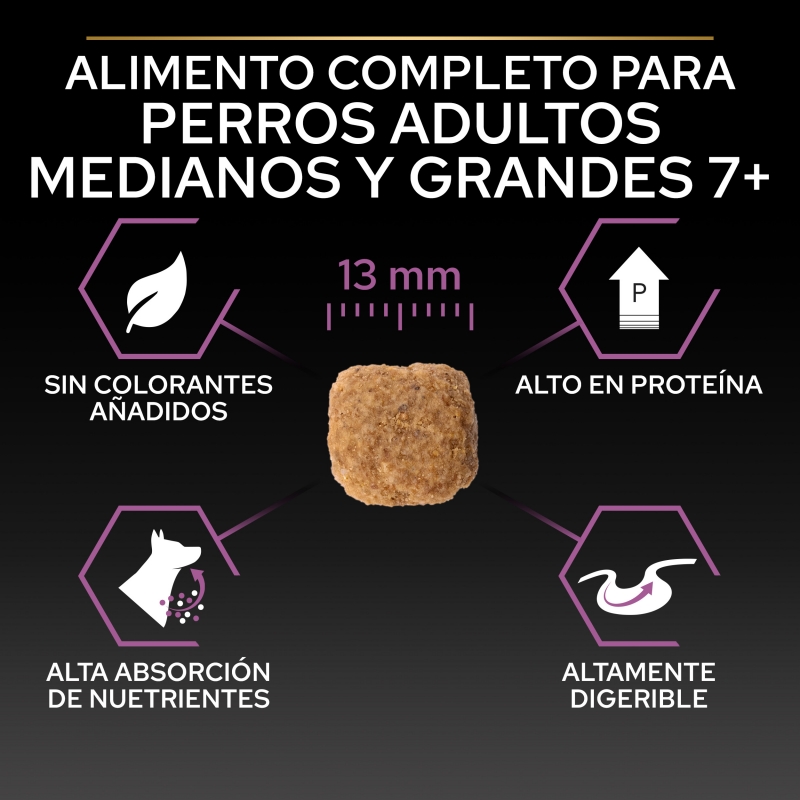 PURINA® PRO PLAN® Medium & Large 7+ Age Defense enriquecido con Pollo es un alimento completo y balanceado diseñado para perros de razas medianas y grandes a partir de los 7 años. Con el pollo como ingrediente principal, garantiza una nutrición de alta calidad. Este alimento ha demostrado mejorar la curiosidad y la capacidad de respuesta de tu animal, optimizando su función cognitiva en tan solo 30 días.