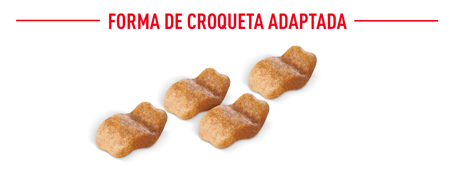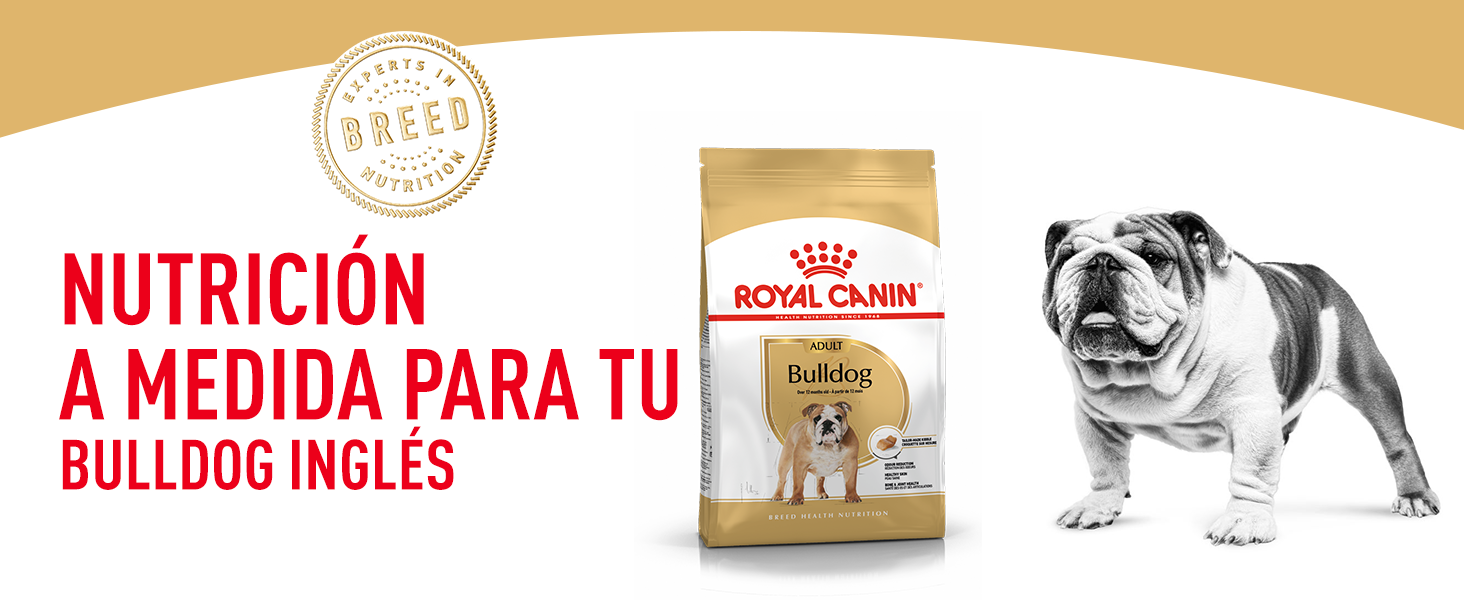 La croqueta de ROYAL CANIN® Bulldog Adulto ha sido adaptada exclusivamente a los perros de raza Bulldog, ya que una de las características de esta raza es su nariz vuelta hacia arriba y la diferencia de tamaño de las mandíbulas, (la superior es más corta que la inferior), por lo que, el tamaño y la forma de la croqueta se han adaptado específicamente para facilitar la ingestión de alimentos.