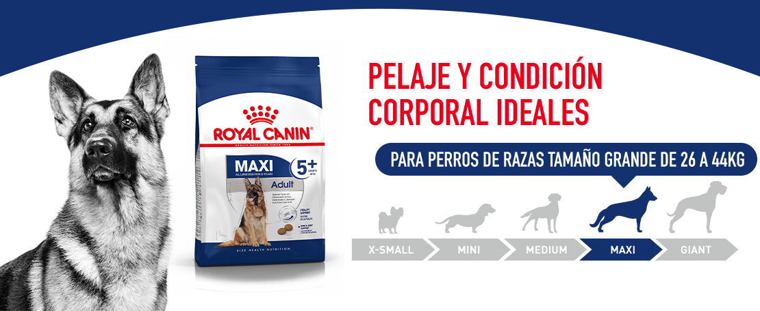 Maxi Adult 5+ de ROYAL CANIN® es un alimento adecuado para perros de tamaño grande de más de 5 años, con un peso adulto entre 26 y 44 kg.