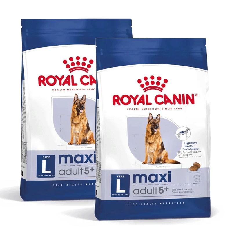 El alimento para perros Maxi Adult 5+ de ROYAL CANIN® ha sido cuidadosamente formulado teniendo en cuenta todas las necesidades nutricionales de los perros de mediana edad y es adecuado para perros de gran tamaño de 5 años o más, con un peso adulto que varía entre 26 y 44 kg.