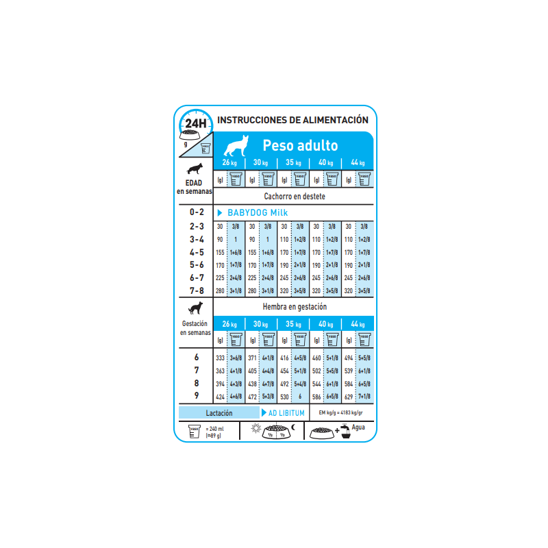 | 35 Kg | BABY DOG MILK | 30g | 110g | 170g | 190g | 245g | 320g |