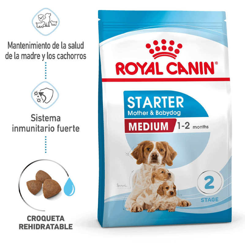ROYAL CANIN® Medium Starter Mother & Babydog ha sido minuciosamente diseñado para abordar las necesidades nutricionales de las madres después del parto y de sus cachorros. Esta fórmula está dirigida a perras adultas de tamaño mediano que pesan entre 11 y 25 kg, así como a cachorros en proceso de destete, que tienen hasta 2 meses de edad. Nuestro alimento personalizado está especialmente adaptado para satisfacer las elevadas demandas energéticas de las perras de raza mediana y, al mismo tiempo, promover el desarrollo saludable de sus cachorros en este período crucial.