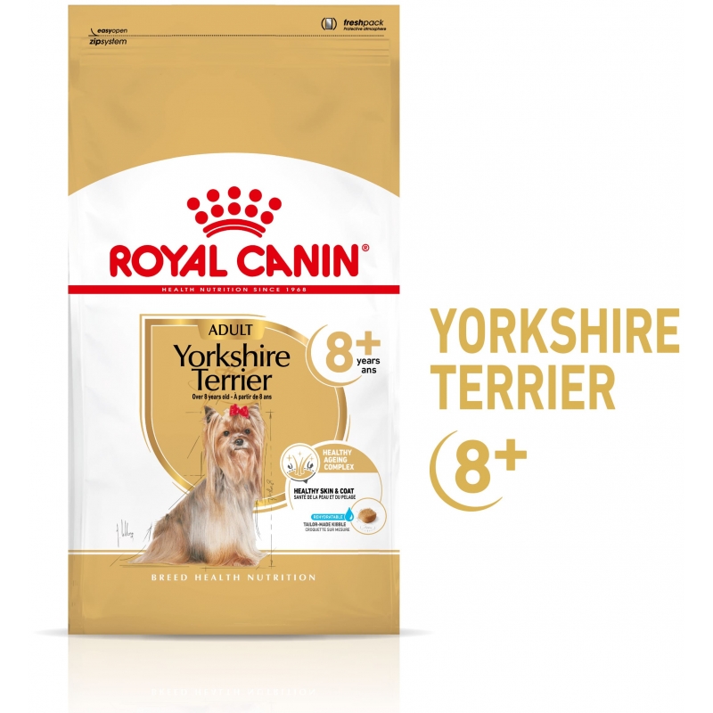 Royal Canin Yorkshire Terrier Ageing 8+ es un alimento diseñado para Yorkshire Terrier mayores de 8 años, creado para preservar la vitalidad, mantener la piel y el pelo brillantes y favorecer la higiene bucal con una croqueta específica.
