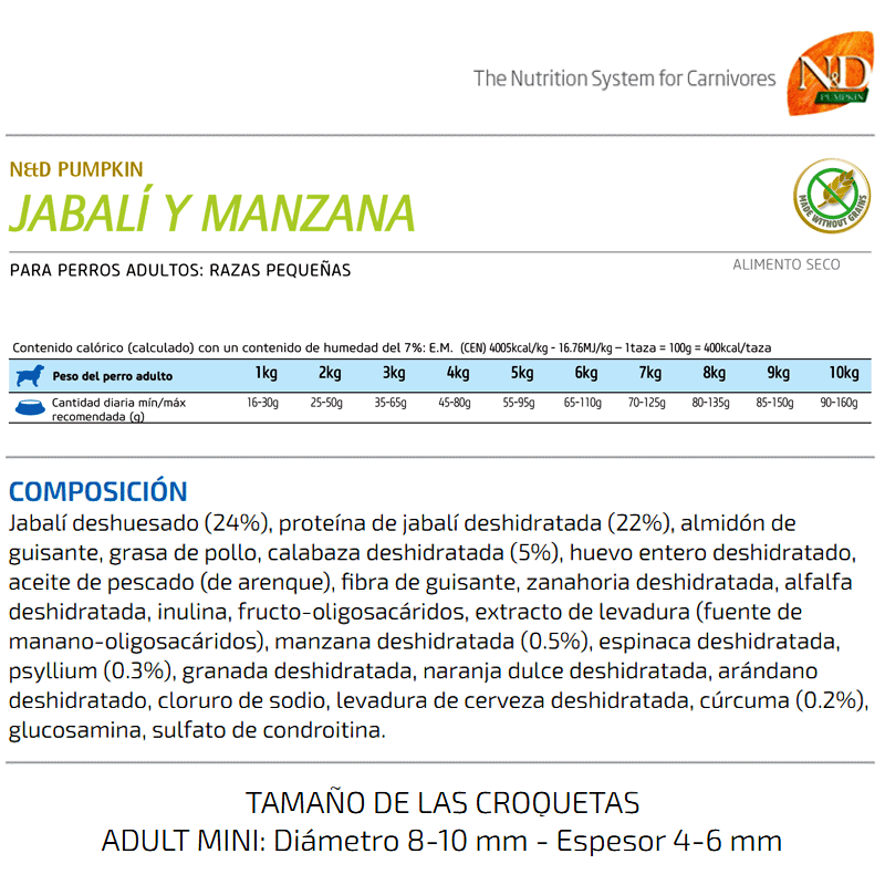 Farmina ND Pumpkin Grain Free Jabalí brinda un equilibrio perfecto de proteínas, grasas, carbohidratos, minerales y vitaminas. Además, no contiene cereales, aditivos ni conservantes artificiales, lo que lo convierte en una elección natural y saludable para nutrir a tu perro adulto de raza pequeña.