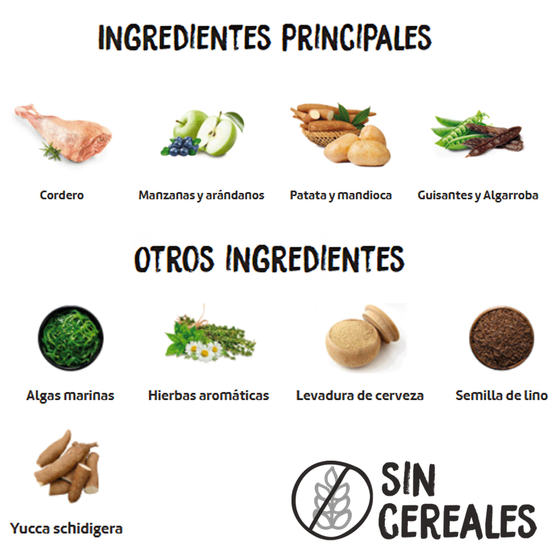 Cordero fresco* (min. 40% antes de la extrusión), cerdo deshidratado (15%), guisantes enteros* (8%), grasa animal (preservada con antioxidantes naturales), cordero deshidratado (6%), raíces de mandioca* (6%), pescados deshidratados 5% (anchoveta, jurel y caballa), patata deshidratada* (5%), levadura de cerveza* (2%), vaina de algarroba* (2%), pulpa de remolacha, semilla de lino* (1%), huevo deshidratado* (1%), manzana* (1%), alfalfa deshidratada*, aceite de pescado (preservado con antioxidantes naturales), sal gema*, fructo y manano oligosacáridos, algas marinas deshidratadas* (500 mg/kg), glucosamina (500 mg/kg), yucca schidigera, condroitín sulfato (100 mg/kg), arándanos* (100 mg/kg), tomillo* (80 mg/kg), flor de manzanilla* (80 mg/kg), hinojo* (80 mg/kg), equinácea* (80 mg/kg), té verde* (80 mg/kg). *INGREDIENTES NATURALES